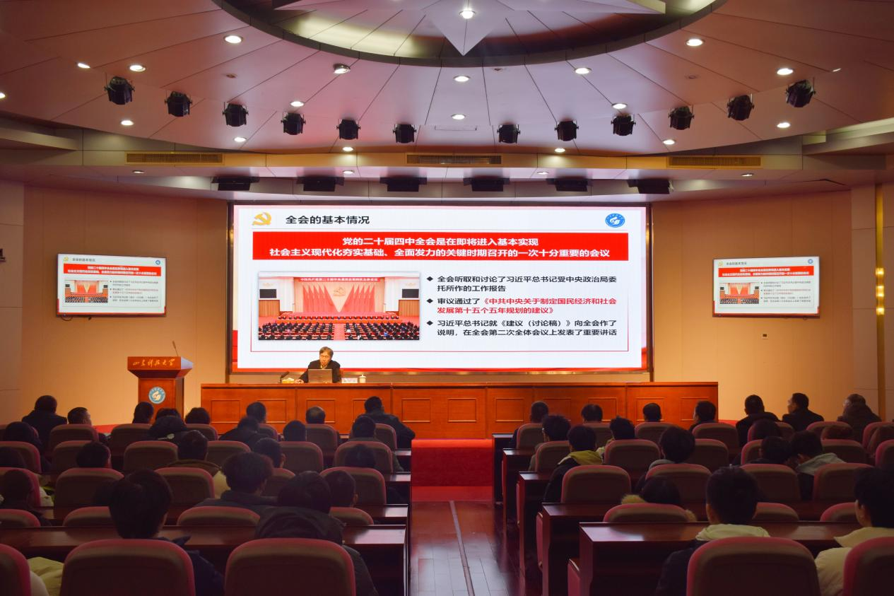 薛庆忠围绕党的二十届四中全会整体情况、准确把握“十五五”时期在基本实现社会主义现代化进程中的重要地位、深刻领会“十五五”时期经济社会发展的指导方针和主要目标、全面理解“十五五”时期经济社会发展战略任务和重大举措、坚持和加强党的全面领导五大方面,作了系统而深入的阐释。他结合学校 、人才培养、科研创新等发展实际,就中央全会精神在学校的贯彻落实作出具体部署,明确了各学院结合专业特色推进全会精神落地的实践路径。