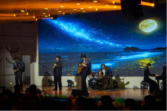 晚会期间还穿插了互动游戏和抽奖环节,欢呼声、掌声此起彼伏,现场洋溢着欢乐祥和的节日气氛。最后晚会在全体演职人员合唱的《日不落》中圆满落幕,温馨的旋律萦绕礼堂,师生们挥舞着荧光棒,共同定格这一美好瞬间。